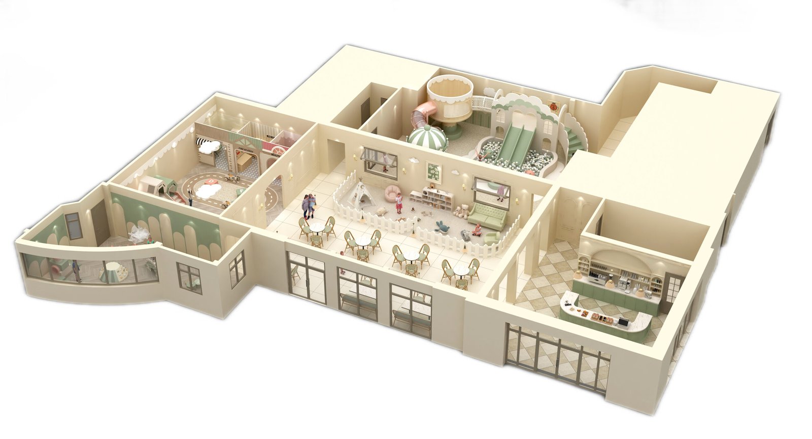 Integrated Sightlines: The central open-plan seating area is positioned to offer 360-degree visibility. Parents can sip coffee while maintaining visual contact with their children in any zone.