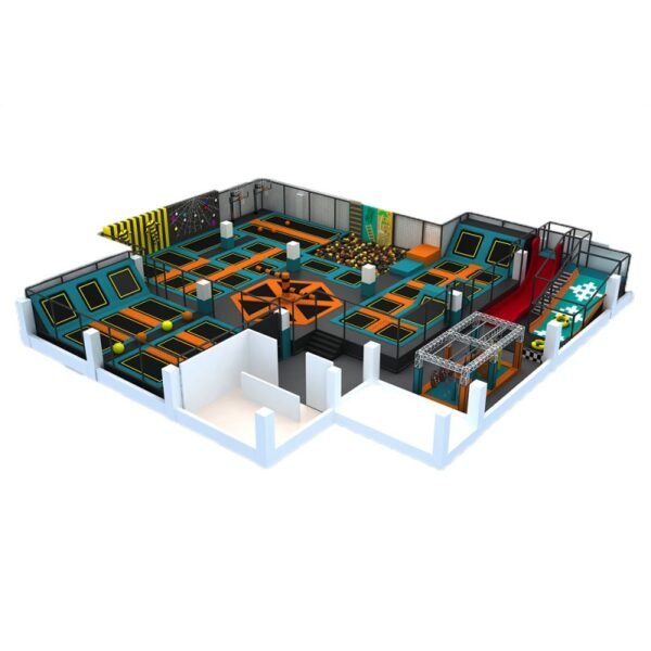 tep into a world of active adventure at our indoor trampoline park! Designed with vibrant blue-green trampolines accented by orange lines, the space is both visually engaging and functionally optimized for endless bouncing fun. Challenge yourself on the yellow-striped climbing wall, then race down the thrilling red slide for an extra rush. Basketball hoops add a playful competitive edge, while the bright, clean environment ensures a safe and inviting atmosphere for jumpers of all ages. Whether for family fun, fitness, or friendly gatherings, our park delivers high-energy entertainment in a colorful, modern setting that keeps guests coming back.