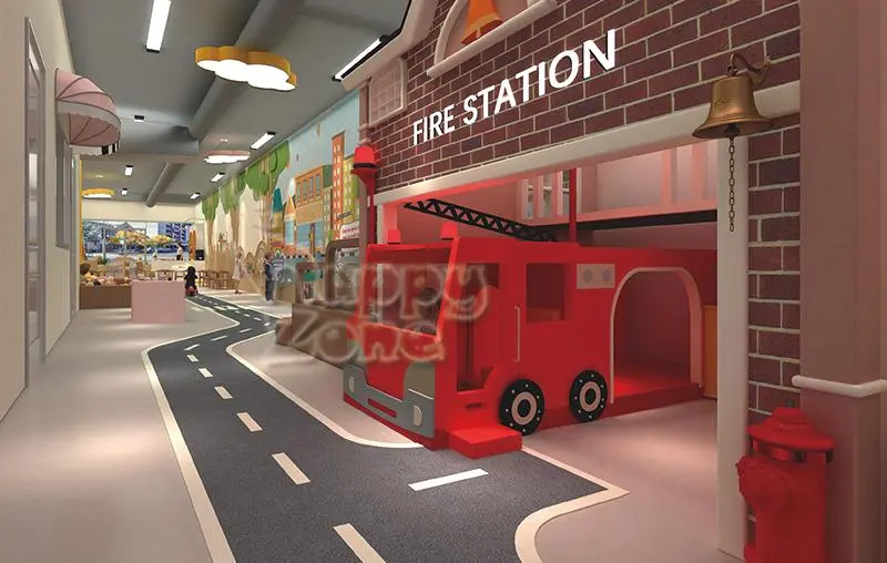 Explore themed pretend play / imaginative play concepts including supermarket, kitchen, hospital, makeup & beauty salon, car wash & repair, police station, fire station, construction site, pet care center, and farm experience. All role play equipment can be customized by layout, theme, and finishes to match your commercial space and project requirements.