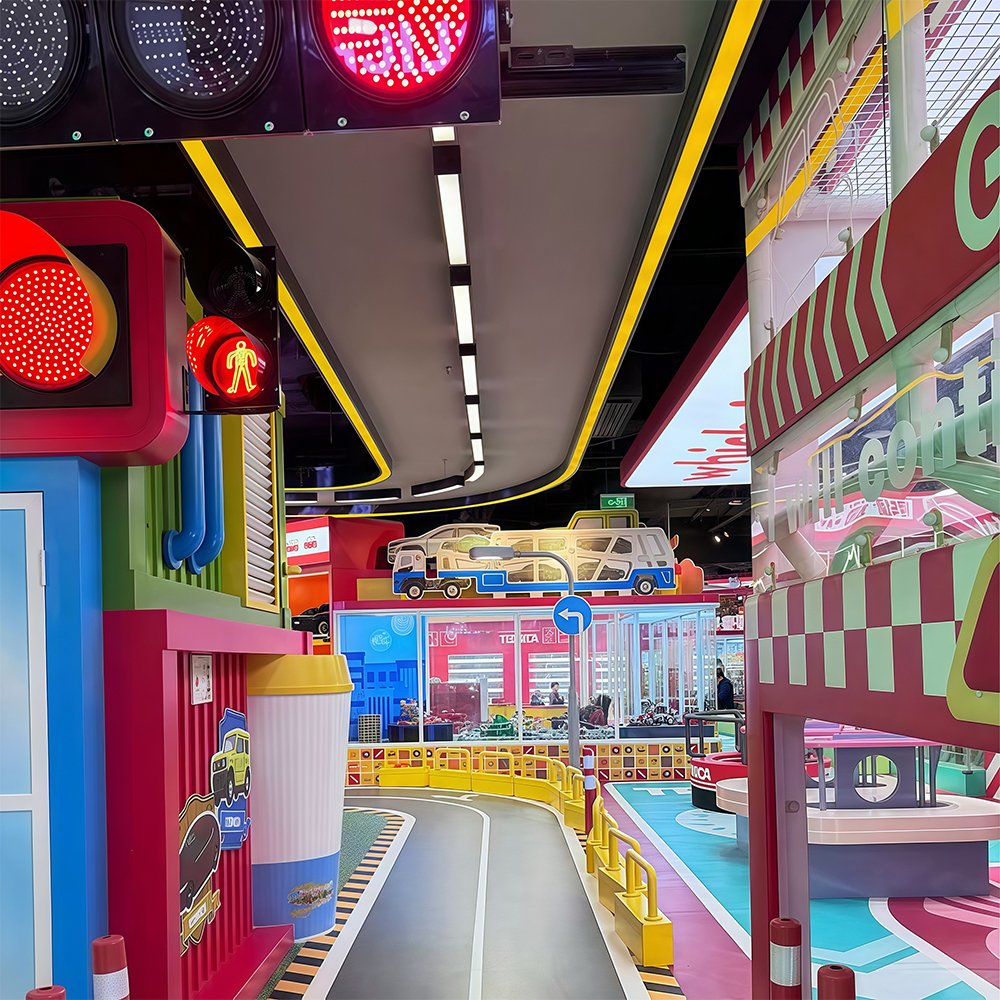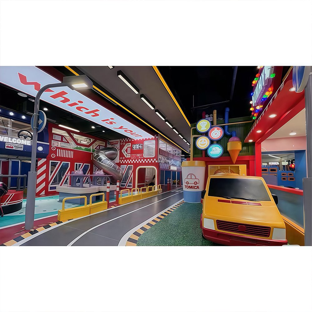 This transportation-themed playground features vibrant colors like red, yellow, and blue. The entire design exudes childlike playfulness. Our designers meticulously crafted the rides in the shape of various vehicles, captivating children. The playground offers a wide variety of activities, including role-playing, a ball pool, a slide, a trampoline, and more.If you’d like to create a playground like this, please contact me.